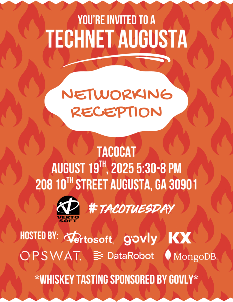You are invited to a Networking Reception hosted by Vertosoft, OPSWAT, MongoDB, Govly, DataRobot and KX at TechNet Augusta. Come and join us at Tacocat on August 19th, from 5:30-8pm EST. To attend, please fill out the form on this page. Don’t forget to bring your conference badge to scan at the door.